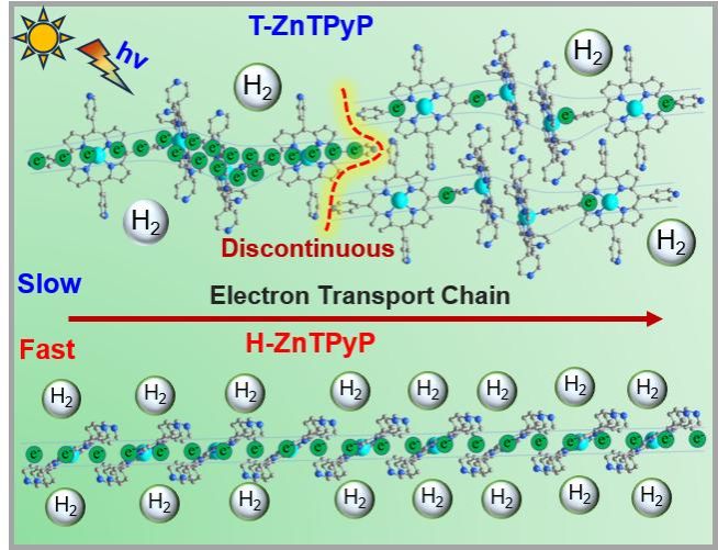 针对此问题,河南大学白锋教授团队在不同组装温度下合成了5,10,15,20-四(4-吡啶基)锌卟啉四棱纳米棒(T-ZnTPyPs)和六棱纳米线(H-ZnTPyPs)两种堆积结构的组装体。相比于T-ZnTPyP,H-ZnTPyPs表现出显著增强的可见光催化产氢活性。通过对有关光催化活性相关参数和理论计算的比较分析表明,高的光催化活性主要归因于H-ZnTPyP中长程π-π堆叠形成的的连续且通畅的电荷载体传输通道提高了其光生电子的传输效率。这项研究为合理设计具有可控π-π堆叠和高光催化性能的超分子光催化剂提供了一个理想的科学平台。