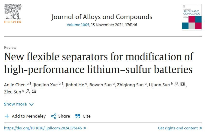 孙自许教授团队综述了储能电池领域最新研究动态,该综述以“New flexible Separators for Modification of high performance Lithium–Sulfur Batteries”为题,发表在国际期刊《合金与化合物杂志》(Journal of Alloys and Compounds)上。