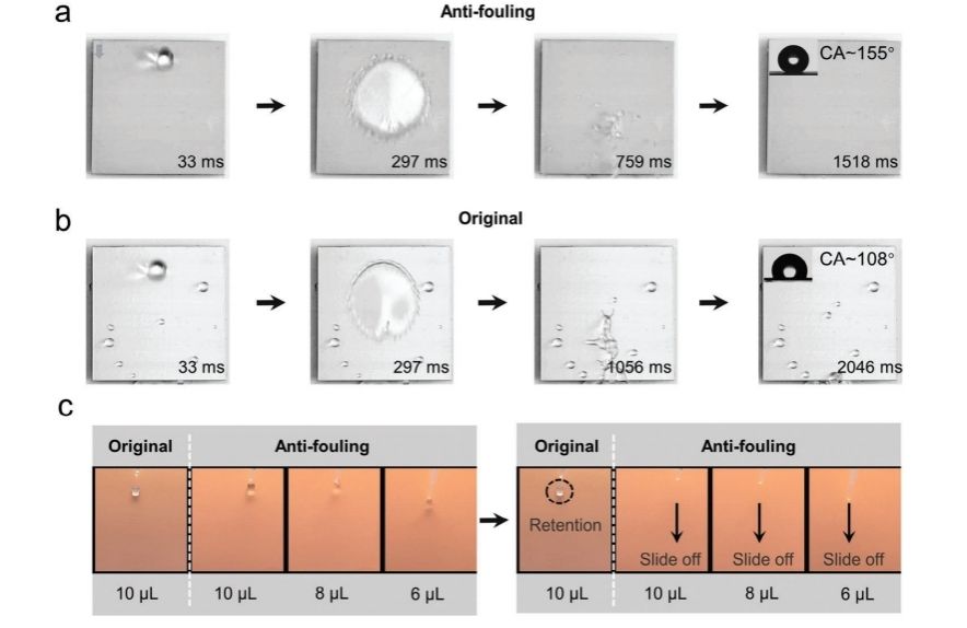 图一:水滴在抗污染表面与未处理表面的润湿性对比