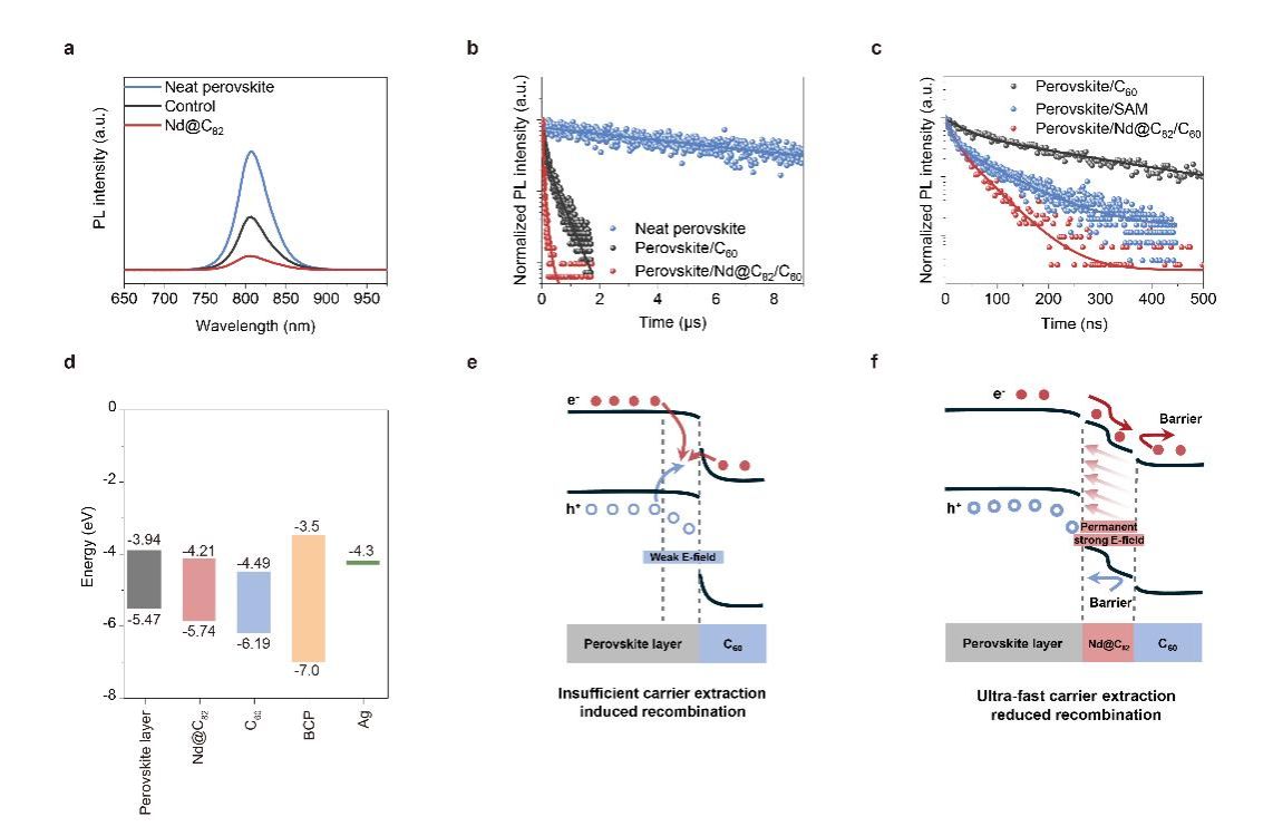 图3 Nd@C82-PMMA耦合层用于平衡电荷载流子传输。(a)钙钛矿薄膜、对照组薄膜(钙钛矿/C60)和Nd@C82(钙钛矿/Nd@C82/C60)薄膜的光致发光光谱图;(b)钙钛矿薄膜、对照组薄膜(钙钛矿/C60)和Nd@C82(钙钛矿/Nd@C82/C60)薄膜的时间分辨荧光光谱图;(c)钙钛矿/C60薄膜、钙钛矿/自组装单层(SAM)薄膜、钙钛矿/Nd@C82/C60薄膜的时间分辨荧光光谱图;(d)钙钛矿和电子传输层之间的能带排列;(e-f)能带排列示意图。