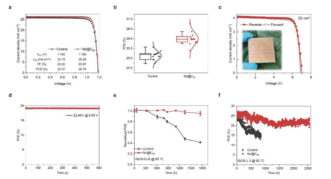图4 基于Nd@C82制备器件的光伏性能。(a)最优的对照组和基于Nd@C82制备器件的J-V曲线;(b)从J-V曲线中获得的光电转换效率值的统计数据;(c)基于Nd@C82制备的最优模组的J-V曲线;(d)最优模组的最大功率点输出曲线;(e)基于ISOS-D-2I测试协议下器件的稳定性;(f)基于ISOS-L-3测试协议下器件的稳定性。
