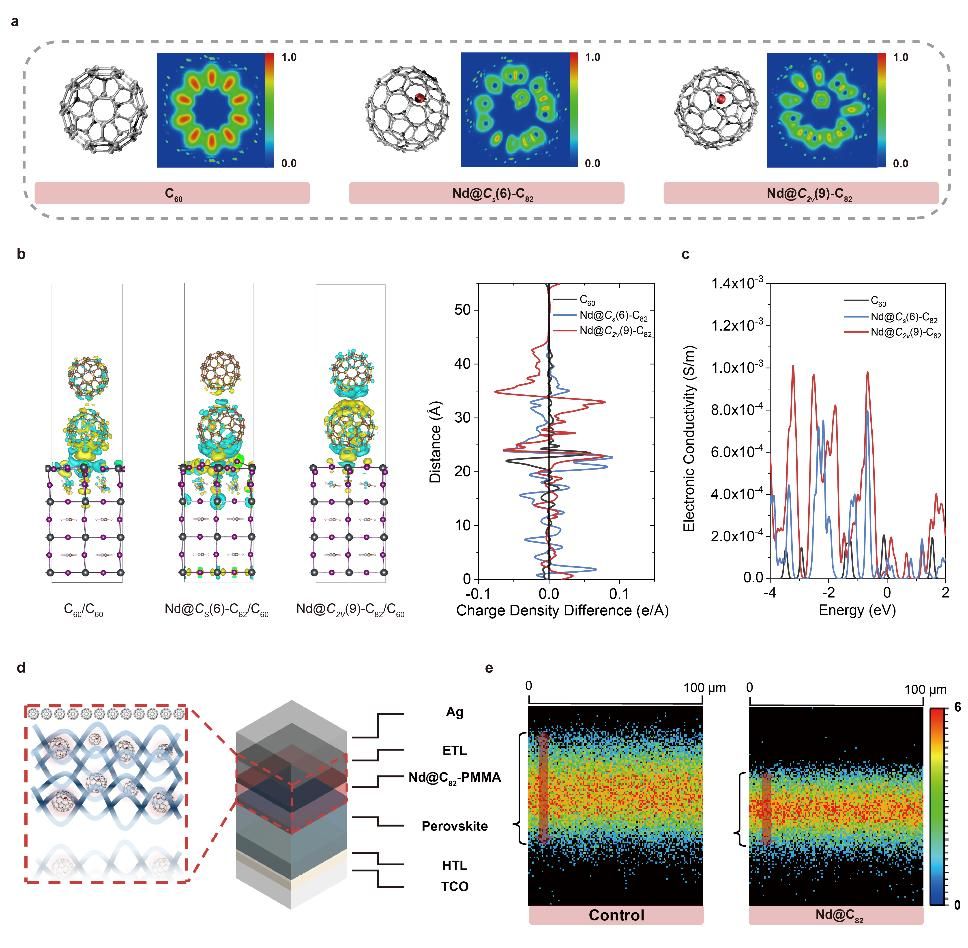 图1 内嵌金属富勒烯Nd@C82-聚甲基丙烯酸甲酯(PMMA)耦合层助力超快电子提取和离子扩散抑制。(a)C60,Nd@Cs(6)-C82,以及Nd@C2v(9)-C82的分子结构以及相应的电子局域化函数(ELF);(b)钙钛矿/富勒烯的电荷密度差分布(CDD);(c)计算出的不同富勒烯电子电导率;(d)具有Nd@C82-PMMA耦合层的倒置钙钛矿太阳能电池(PSC)的器件结构示意图;(e)横截面飞行时间二次离子质谱图。