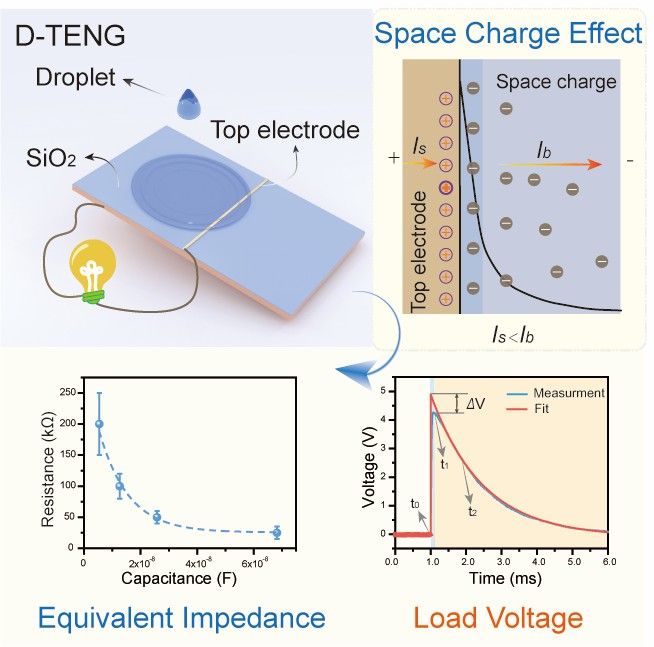 基于液滴的摩擦纳米发电机(D-TENG)是液滴能量收集领域的一种极具前景的范式。然而,D-TENG仍面临高等效阻抗、电压曲线偏离理论等严重问题,这些问题会导致能量利用效率低下。公认的机制普遍忽略了固液界面对电荷传输速率的影响,使得固液界面的相关机理仍未被完全理解。值得注意的是,这一知识空白体现在两方面:一是理论预测与实验测量的系统性差异,二是等效阻抗的异常。研究团队构建并测量了一系列具有不同固有电容的D-TENG器件,分析了液滴/顶电极界面电双层(EDL)处感应电荷的传输过程。结果表明:空间电荷效应限制了感应电荷的转移速率,且D-TENG的固有电容会调控这一限制的强度。实验进一步阐明了影响等效阻抗的关键因素:D-TENG的固有电容和液滴浓度。最终实现了约4.25 mC/m²的最大电荷密度,以及约5000 Ω的低等效阻抗。