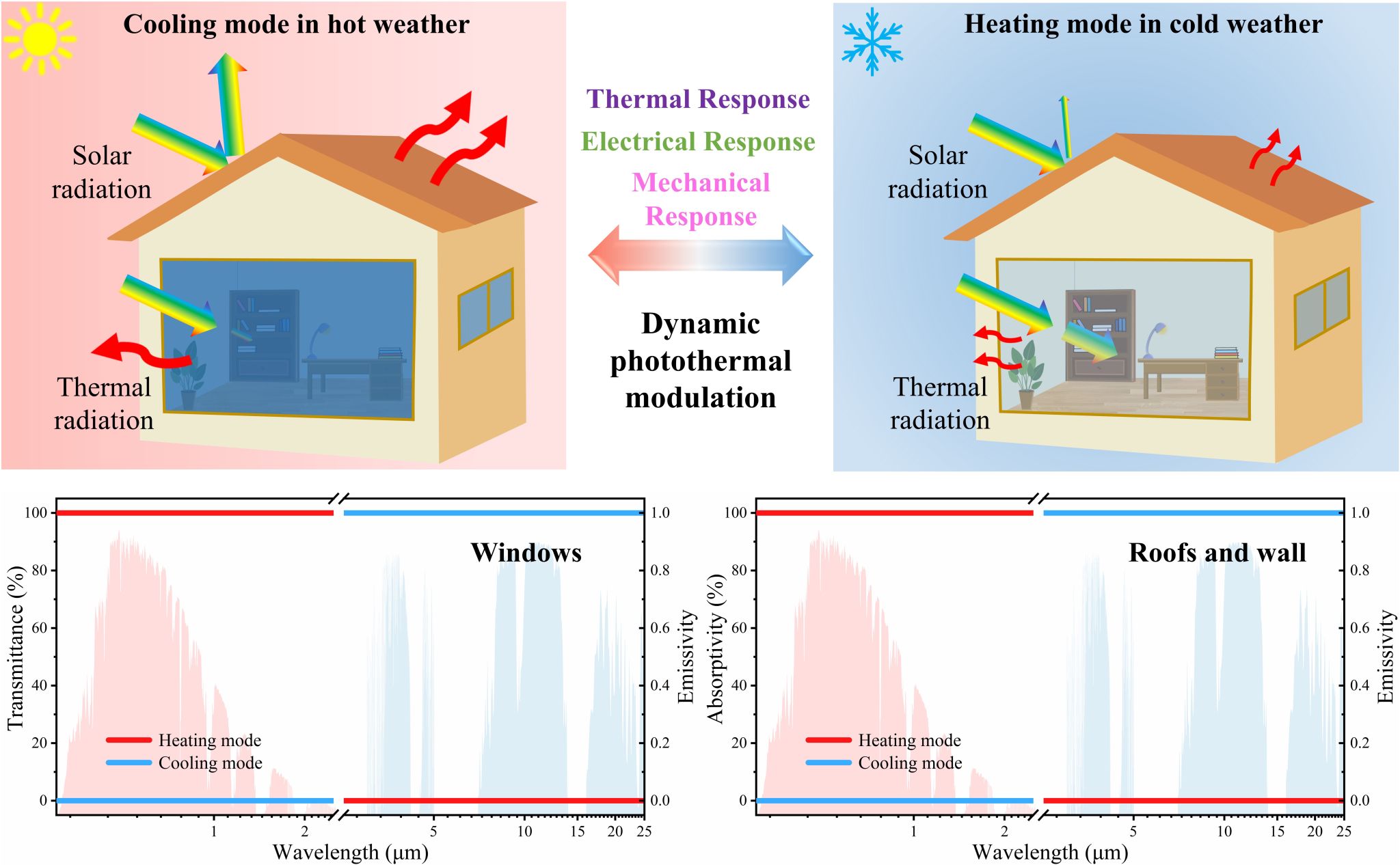 综述详细阐述了热响应、电响应与机械响应材料在可见光至中红外波段的宽光谱协同调控策略,探讨了其在建筑关键组件(窗户、屋顶和墙壁)的应用及节能效果。重点介绍了法布里-佩罗(F-P)谐振腔、热致变色水凝胶、电致变色器件和机械翻转装置在结构设计、材料创新、设备优化和集成策略等方面的最新进展。最后,文章强调了将这些技术从实验室规模的演示过渡到实际应用所面临的挑战和机遇,展望了其在塑造未来可持续建筑中的广阔前景。
