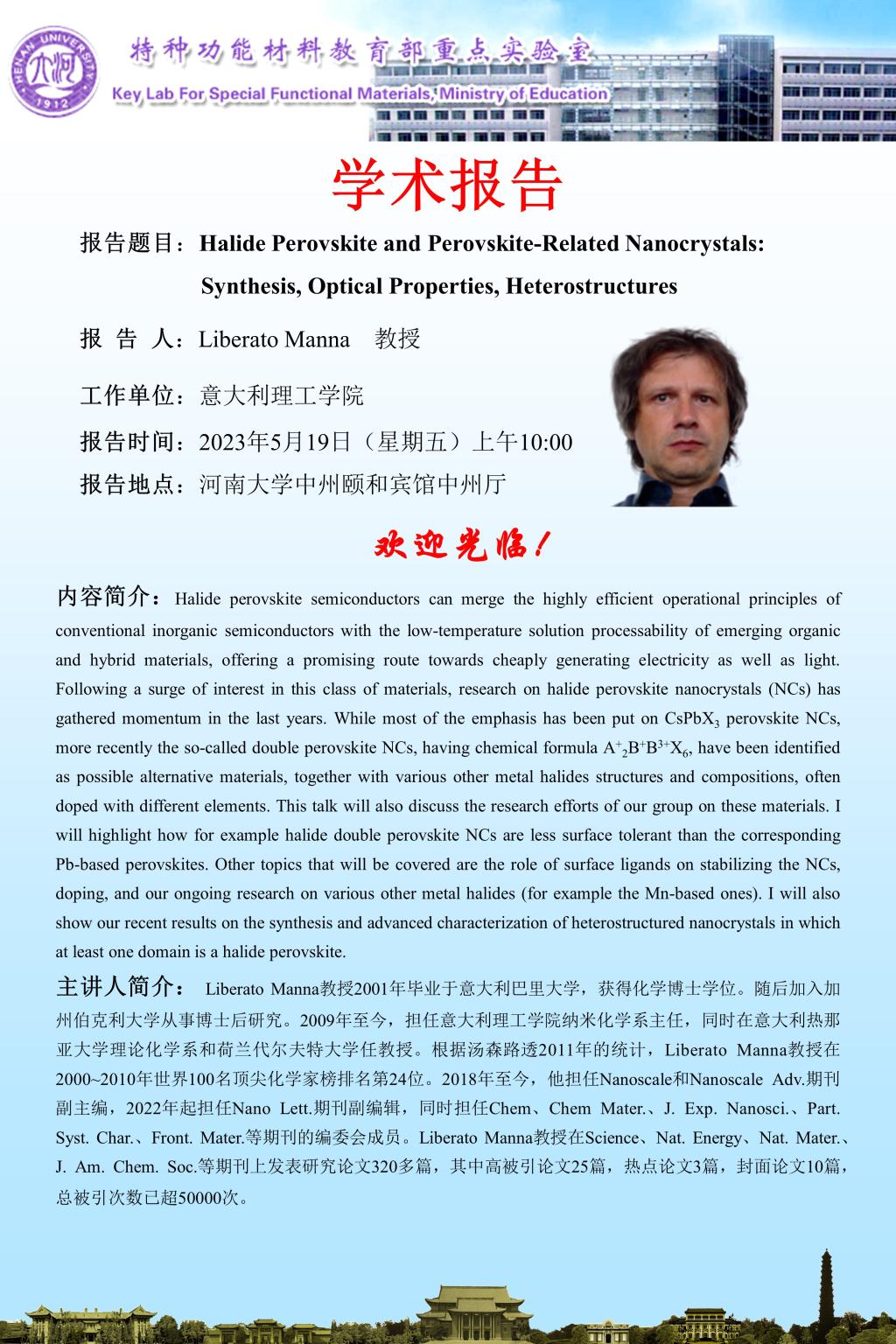 Liberato Manna: Halide Perovskite and Perovskite-Related Nanocrystals: Synthesis, Optical Properties, Heterostructures(时间5.19)