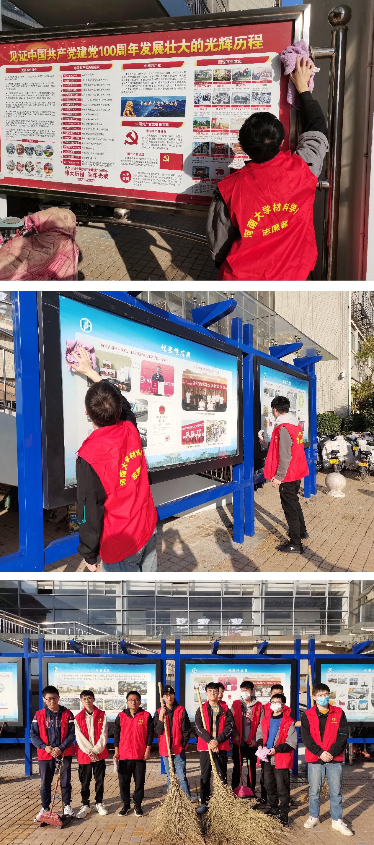 2019级和2020级学生志愿者在2019级本科生团支书刘源义的组织下积极参与对学院环境卫生清扫并擦拭学院宣传栏的志愿活动。