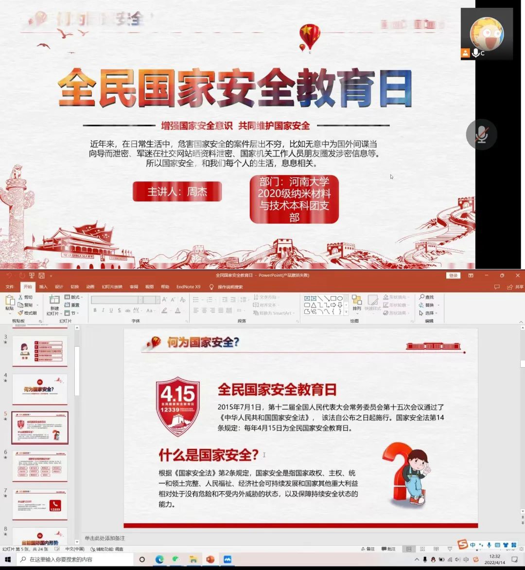 紧扣活动主题——树牢总体国家安全观,感悟新时代国家安全成就,为迎接党的二十大胜利召开营造良好氛围,根据疫情防控要求,于4月14日下午,以线上宣讲的形式开展了国家安全教育日宣传教育主题团日活动。全体本科团支部参加此次宣讲会。