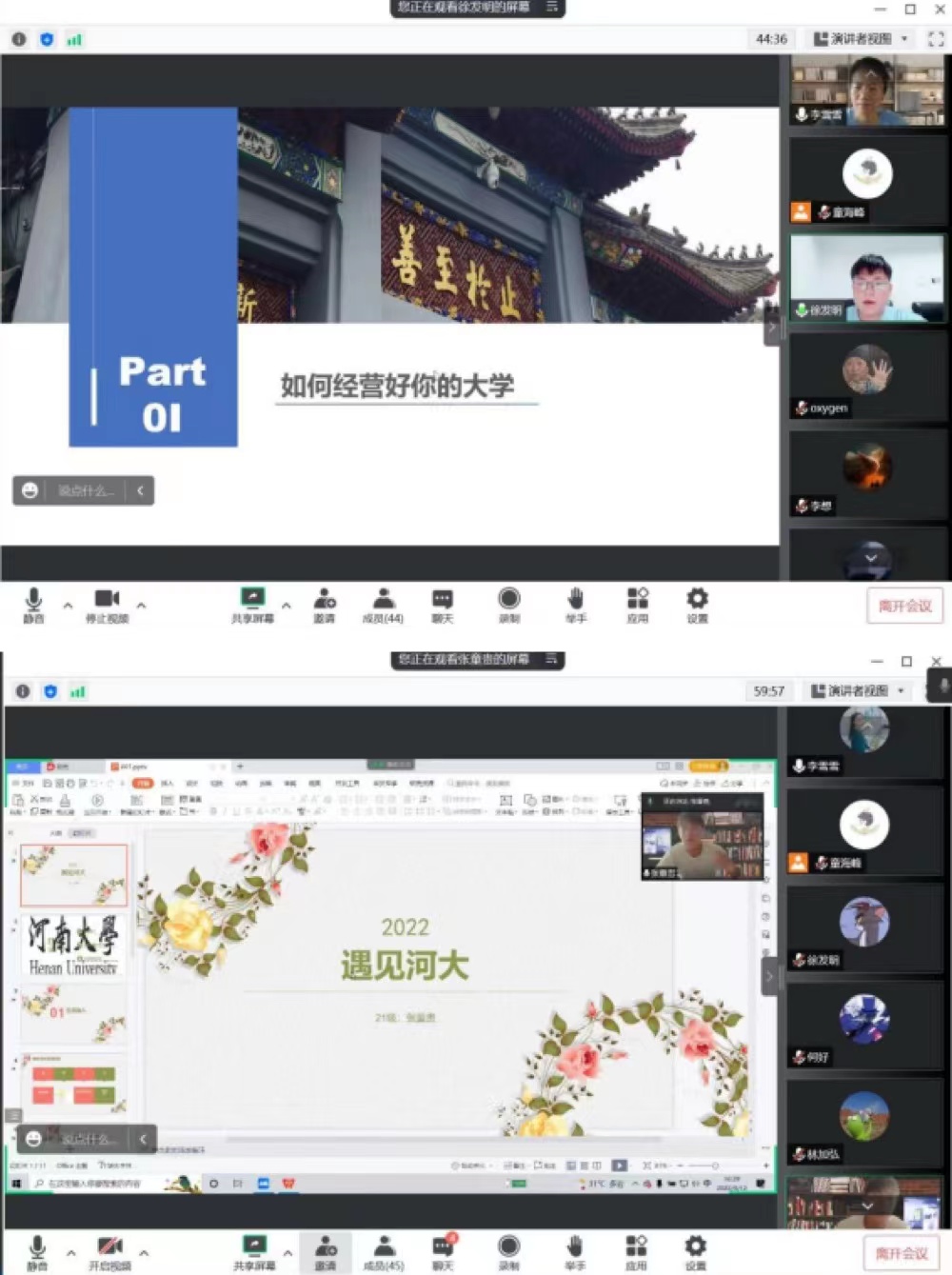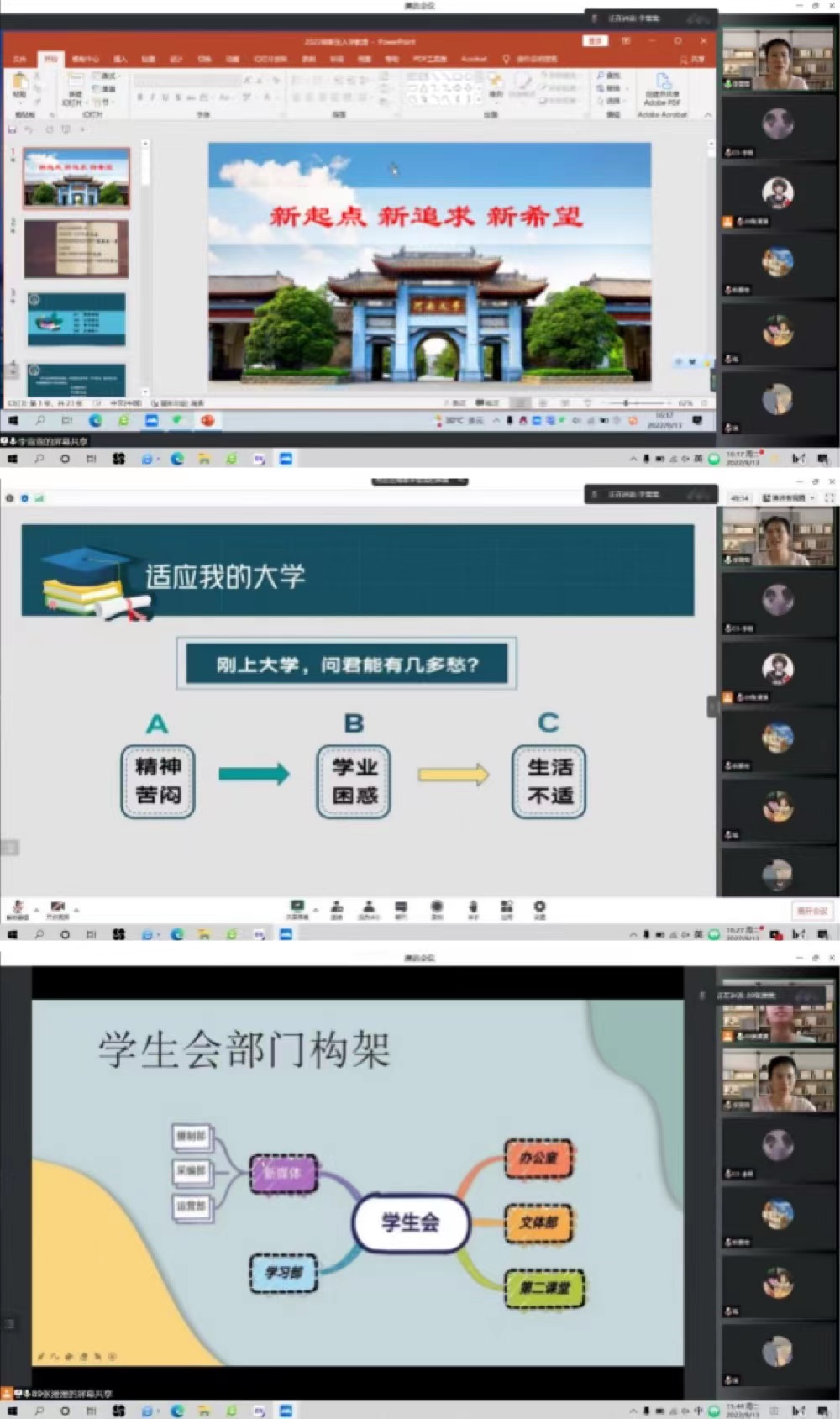 9月13日下午,新生入学适应教育在线上展开,本次主题教育由辅导员李雪雪和老生代表学生会主席团成员张漫漫共同主讲。首先,辅导员李雪雪老师针对大学生在学习和生活中的问题,从角色转变、心里适应、学习转换、生活融入等四大方面展开,引导新生了解、适应大学生活,帮助新生尽快转变角色,做好大学生涯规划。随后,由张漫漫分别就学习、生活、学生工作等方面,结合自身经验,与新同学们分享大学心得体会,解答了新生关于大学生活的诸多疑惑,为新生规划自己的大学生活、确立大学目标提供了重要帮助。同时,她还对学院学生会进行了详细介绍,希望同学们在学习之余,可以通过参加学校学生会、学院学生会、各类社团等组织锻炼能力,提升自我。