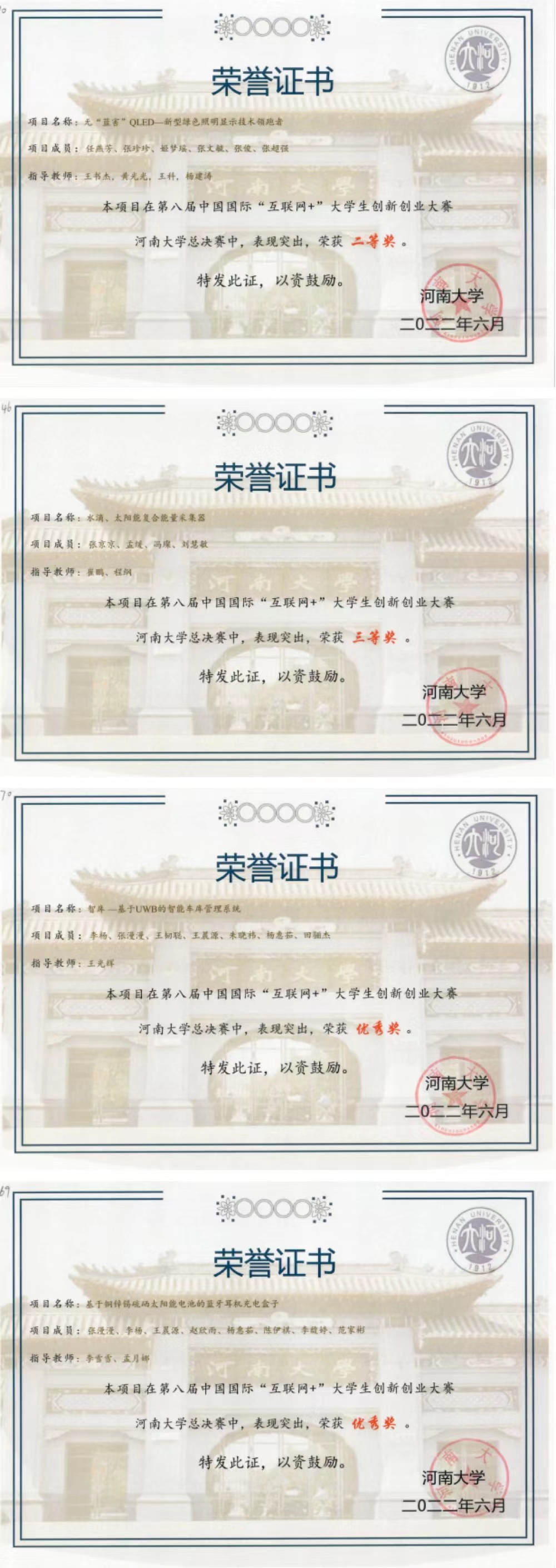 参赛的六个项目中四个获得校级荣誉,分别为《无“蓝害”QLED——新型绿色照明显示技术领跑者》荣获大赛二等奖,《水滴、太阳能复合能力采集器》项目获大赛三等奖,《智库——基于UWB的智能车库管理系统》、《基于铜锌锡硫硒太阳能电池的蓝牙耳机充电盒子》项目获大赛优秀奖。