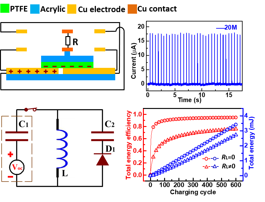 另外,在单极性脉冲TENG的基础上,程纲课题组设计了由电感、二极管和储能电容等简单原件组成的无源电源管理电路,能量存储效率可以达到48.0%,有望在TENG的自驱动传感系统中发挥重要作用。该工作“High energy storage efficiency triboelectric nanogenerator with unidirectional switch and passive power management circuit”在国际著名期刊Advanced Functional Materials(2018, 1805216)上发表。河南大学硕士研究生秦怀方是该论文的第一作者,河南大学程纲教授、香港中文大学訾云龙博士、佐治亚理工学院王中林院士是论文的共同通讯作者。