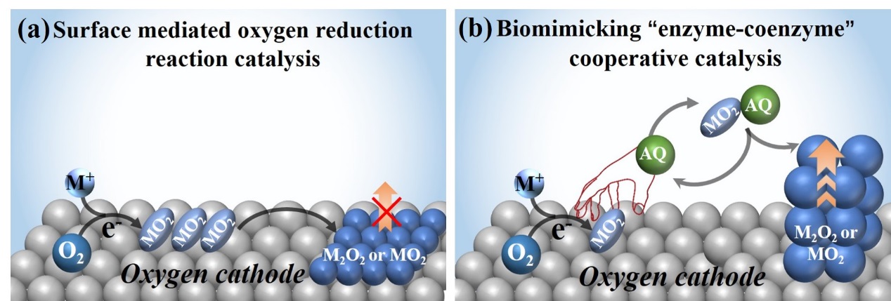 图(a):表面氧还原反应机制(吸附超氧化锂中间体产生的致密、绝缘的放电产物过氧化锂薄膜,造成固体催化剂驱动的氧还原反应容易终止);(b):仿生酶-辅酶协同氧还原反应机制(电解液中的蒽醌分子 (AQ) 和电极中的固体催化剂构成了这一协同催化体系,其中 AQ 作为辅助催化剂从固体催化剂表面捕获、转移吸附态的超氧化物)。