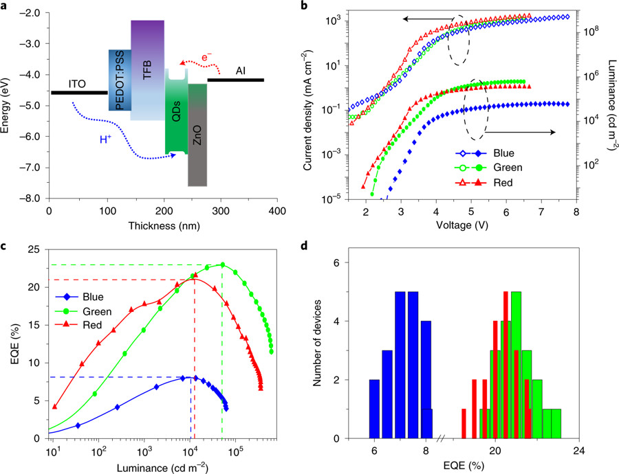 河南大学:兼具高亮度和高效率的量子点发光二极管(Nature Photonics, 13, 192-197 (2019))