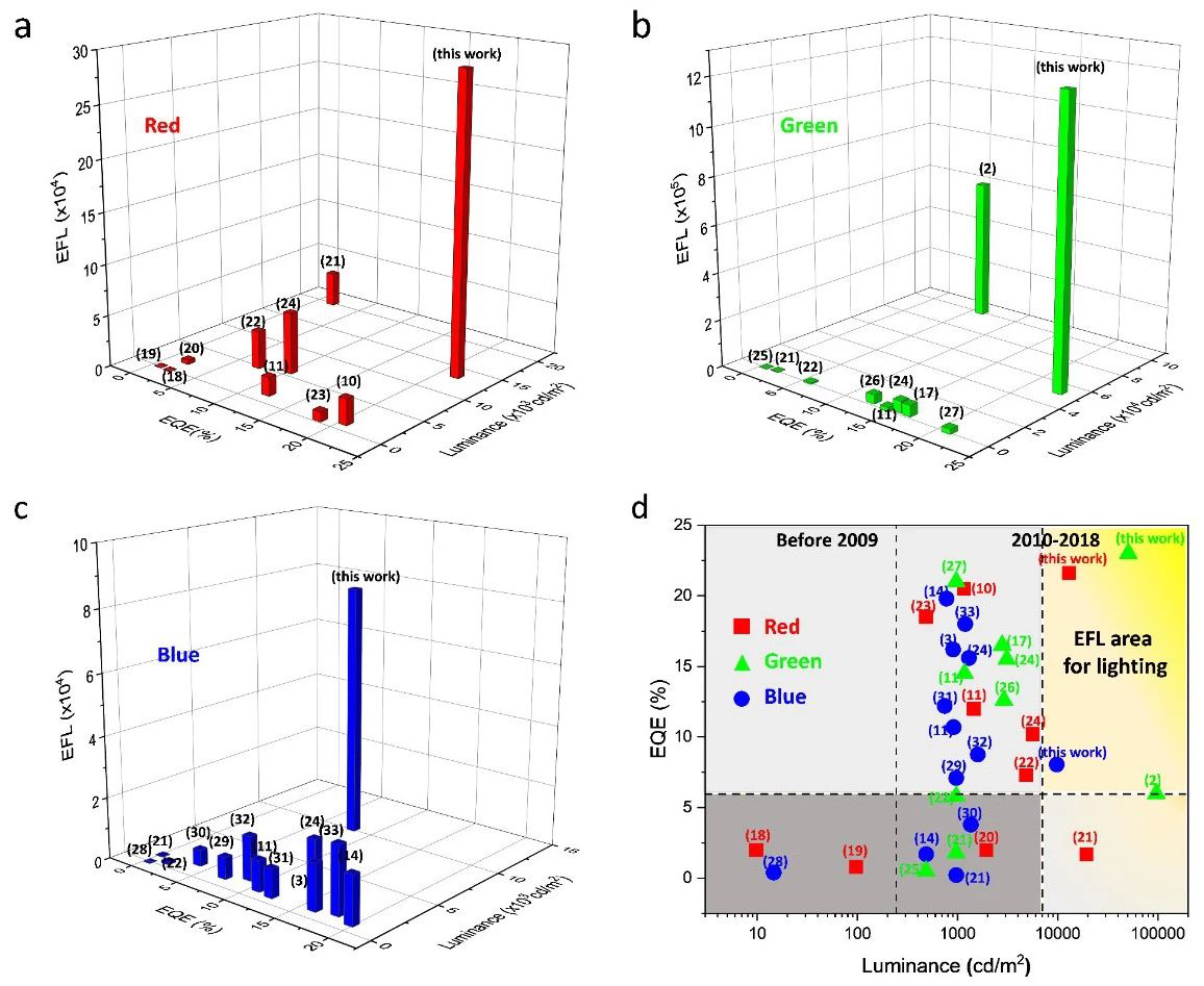 为了更精确地描述新型QLED的发光特性,研究团队引入了一个新概念——“有效亮度(EFL)”,定义为峰值EQE与其相对应发光强度的乘积。图3是本工作三色QLED的EFL与文献已报道工作的比较,可以看到,绿色器件的EFL提高了一倍,红蓝两色有近量级的提升。而且,从照明对亮度和效率的要求来看,本工作得到的三色QLED都已超过了相应的阈值。